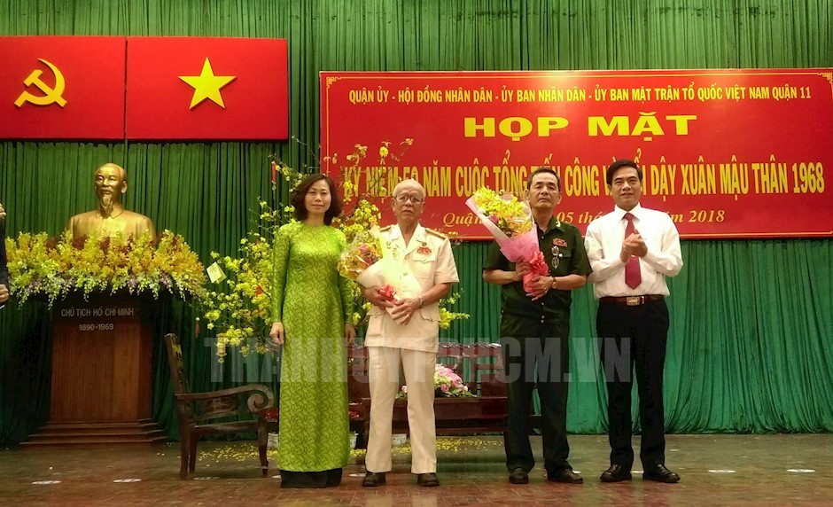 Lãnh đạo Quận 11 tặng hoa cho hai nhân chứng lịch sử trong phần giao lưu.(Thanhuytphcm.vn) – Ngày 5/2, Quận ủy, HĐND, UBND, Ủy ban MTTQ Việt Nam Quận 11 đã tổ chức họp mặt truyền thống kỷ niệm 50 năm cuộc Tổng tiến công và nổi dậy Xuân Mậu Thân 1968. Tham dự có Mẹ Việt Nam Anh hùng Nguyễn Thị Đương, Mẹ Việt Nam Anh hùng Trần Thị Hồng, thân nhân gia đình liệt sĩ, gia đình có công, các thương binh, bệnh binh, cựu chiến binh và những người đã trực tiếp chiến đấu, phục vụ chiến đấu trong cuộc Tổng tiến công và nổi dậy Xuân Mậu Thân.