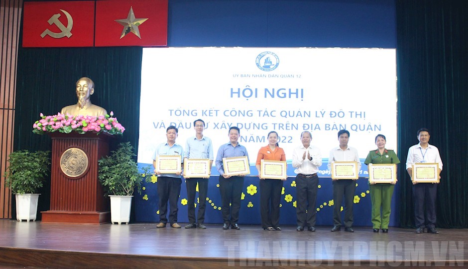 Dịp này, UBND Quận 12 đã khen thưởng 14 tập thể, 35 cá nhân có thành tích xuất sắc trong công tác quản lý xây dựng, công tác kiểm tra xử lý vi phạm về trật tự lòng lề đường, vỉa hè, trật tự an toàn giao thông, vệ sinh môi trường trên địa bàn Quận 12; khen thưởng 3 tập thể, 6 cá nhân có thành tích xuất sắc trong công tác quản lý vi phạm đất đai trên địa bàn Quận 12 cùng các tập thể cá nhân thực hiện tốt Quyết định số 6472/QĐ-UBND của Chủ tịch UBND Quận 12 về ban hành đơn giá thu gom dịch vụ.