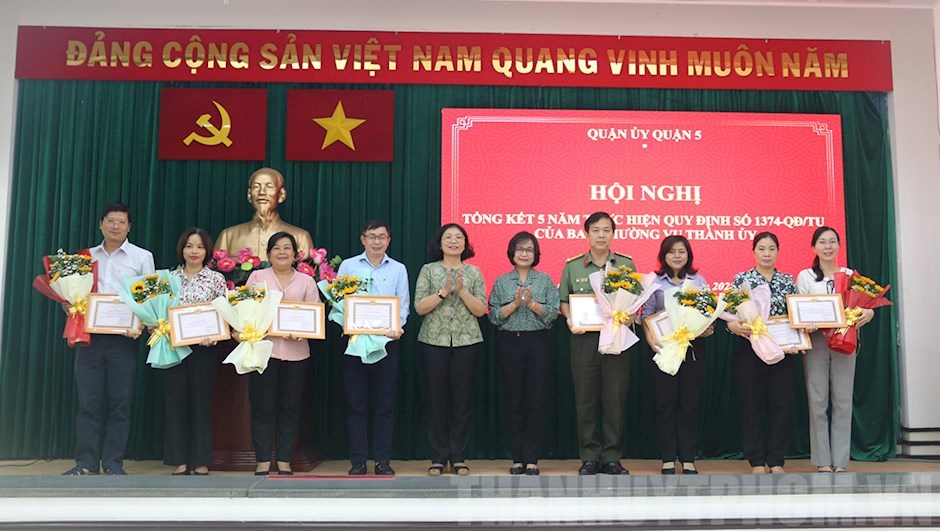 Dịp này, Ban Thường vụ Quận ủy Quận 5 đã khen thưởng 9 tập thể có thành tích xuất sắc trong thực hiện Quy định 1374, giai đoạn 2017-2022.