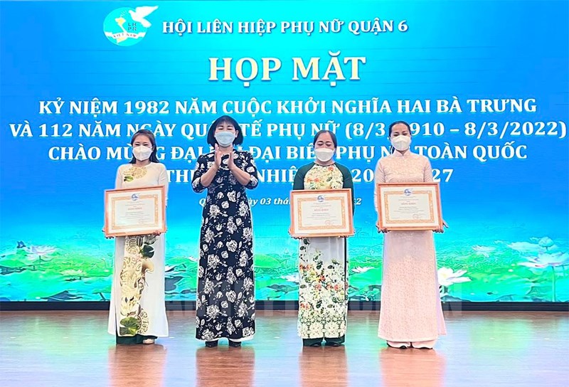 Phó Chủ tịch Hội LHPN Thành phố Trần Thị Phương Hoa trao Bằng khen của Trung ương Hội LHPN Việt Nam cho các tập thể.(Thanhuytphcm.vn) - Sáng 3/3, Hội LHPN Quận 6 tổ chức chương trình Họp mặt kỷ niệm 1982 năm cuộc khởi nghĩa Hai Bà Trưng và 112 năm ngày Quốc tế Phụ nữ (8/3/1910 – 8/3/2022); chào mừng Đại hội đại biểu Phụ nữ toàn quốc lần thứ XIII, nhiệm kỳ 2022 - 2027. Đến dự có các đồng chí: Trần Thị Phương Hoa, Phó Chủ tịch Hội LHPN TPHCM; Ngô Thành Luông, Phó Bí thư Thường trực Quận ủy Quận 6; Lê Thanh Bình, Phó Chủ tịch UBND Quận 6; Lê Thị Thanh Hương, Phó Chủ tịch Ủy ban MTTQ Quận 6; Lương Thanh Trúc, Chủ tịch Hội LHPN Quận 6.