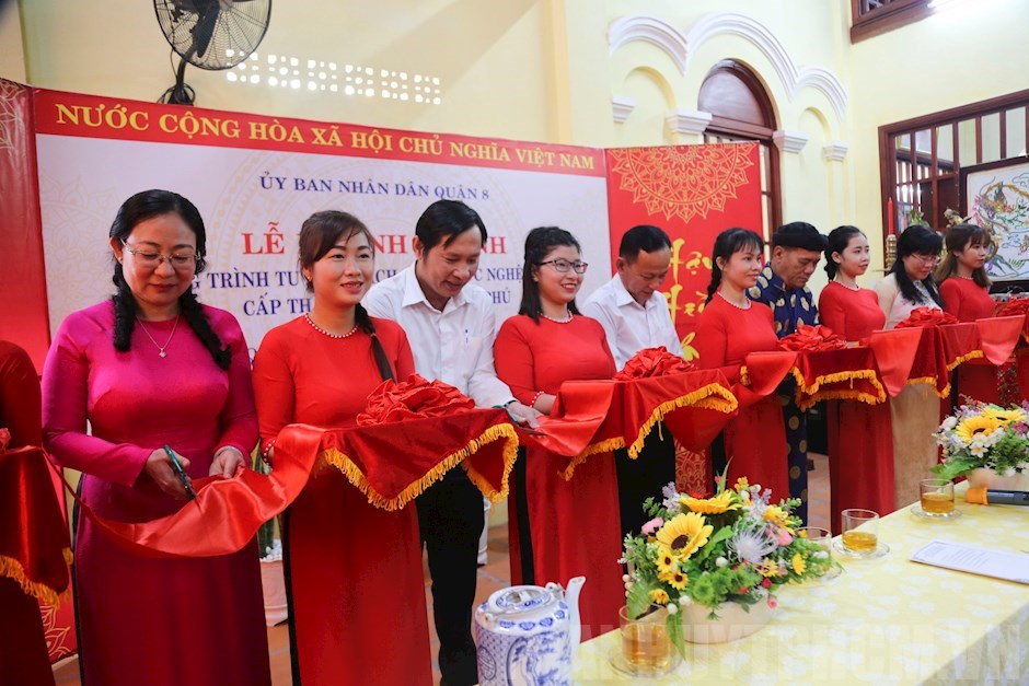 Các đại biểu cắt băng khánh thành(Thanhuytphcm.vn) - Ngày 11/1, UBND Quận 8 tổ chức Lễ khánh thành công trình tu bổ di tích kiến trúc nghệ thuật cấp thành phố Đình Hưng Phú. Đến tham dự có Phó Chủ tịch Thường trực UBND Quận 8 Nguyễn Thanh Sang.
