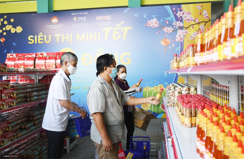 Chuỗi siêu thị mini Tết 0 đồng do các đơn vị, gồm Ủy ban MTTQ Việt Nam TP, Công ty CP Vàng bạc Đá quý Phú Nhuận và Hội Nữ Doanh nhân TP (Hawee) phối hợp tổ chức.