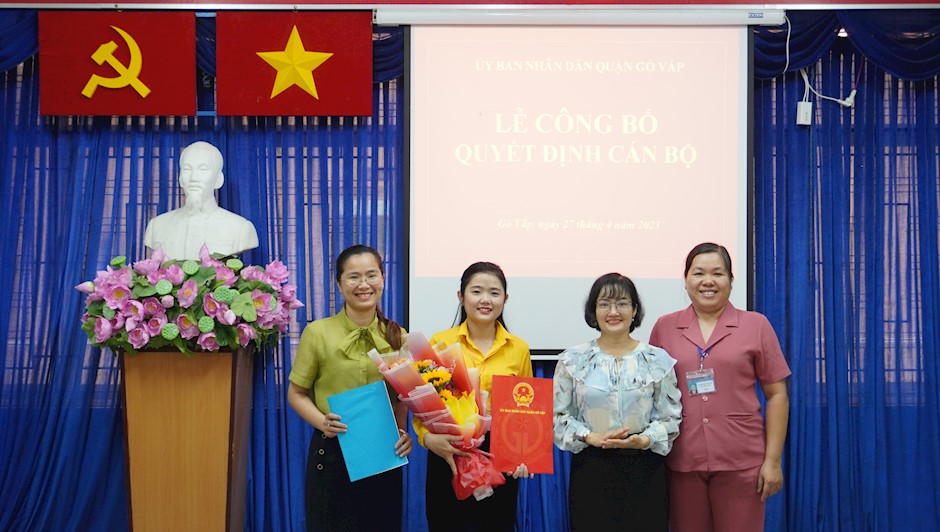 Phó Chủ tịch UBND quận Đào Thị My Thư trao quyết định và tặng hoa chúc mừng đồng chí Trần Thị Ngọc Thúy(Thanhuytphcm.vn) - Ngày 27/4, Phó Chủ tịch UBND quận Gò Vấp Đào Thị My Thư đã chủ trì lễ công bố và trao quyết định bổ nhiệm cán bộ. Cùng dự có Phó Trưởng phòng Nội vụ Nguyễn Thị Vân Huyền; đại diện lãnh đạo Đảng ủy, UBND Phường 8.