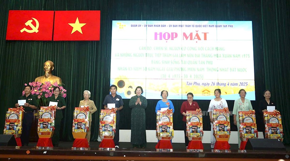 Trưởng ban Tổ chức Thành ủy Văn Thị Bạch Tuyết tặng quà cho các gia đình chính sách, Dân công hỏa tuyến đang sinh sống trên địa bàn quận.(Thanhuytphcm.vn) - Sáng 26/4, Quận ủy, UBND, Ủy ban MTTQ Việt Nam quận Tân Phú tổ chức lễ kỷ niệm 50 năm Ngày Giải phóng miền Nam, thống nhất đất nước (30/4/1975 - 30/4/2025) và họp mặt cán bộ, chiến sĩ, người có công cách mạng và những người trực tiếp tham gia làm nên Đại thắng mùa Xuân 1975 TPHCM đang sinh sống tại quận Tân Phú trên địa bàn quận.