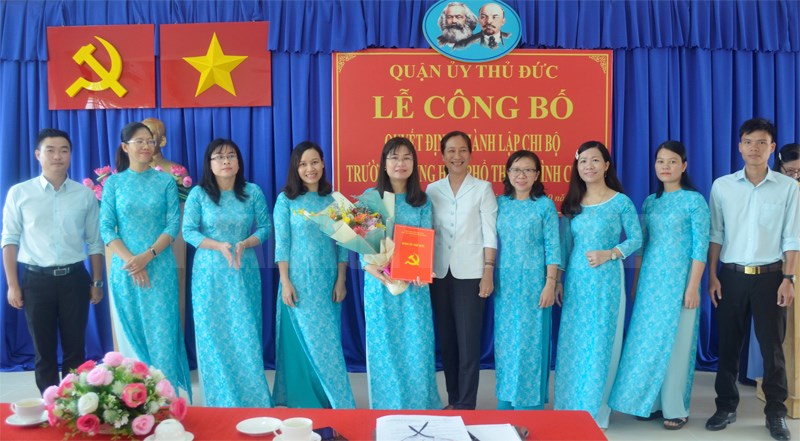 Phó Bí thư Quận ủy Phan Thị Kim Sinh (giữa) trao quyết định thành lập Chi bộ trường THPT Bình Chiểu(Thanhuytphcm.vn) - Ngày 10/10, Quận ủy Thủ Đức đã tổ chức lễ công bố quyết định thành lập Chi bộ trường THPT Bình Chiểu. Đồng chí Phan Thị Kim Sinh, Phó Bí thư Quận ủy đến tham dự lễ.