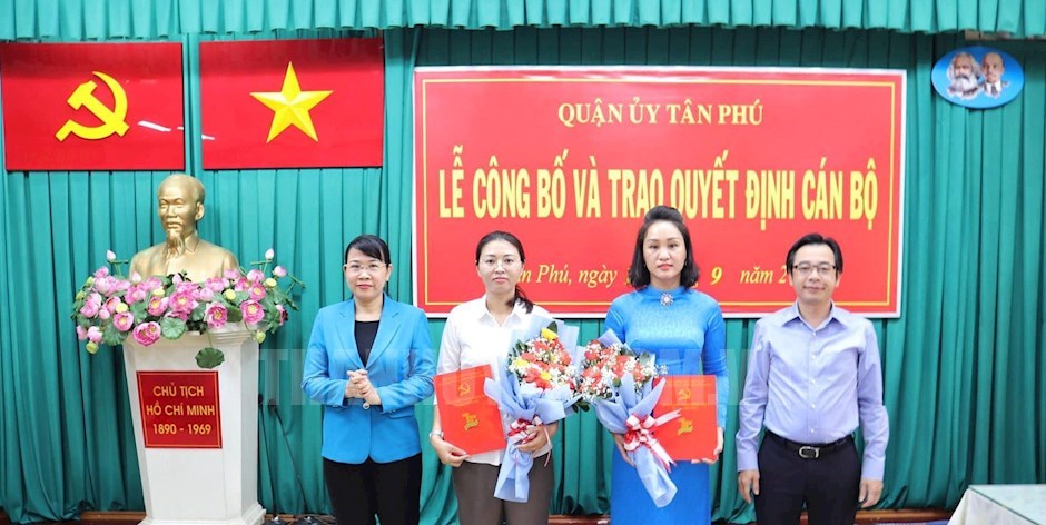 Theo đó, điều động và bổ nhiệm chức vụ Phó Bí thư Thường trực Đảng ủy phường Sơn Kỳ đối với đồng chí Dương Thị Cẩm Tú, Phó Chủ tịch UBND phường Tân Quý; điều động và bổ nhiệm chức vụ Phó Chủ tịch UBND phường Tân Sơn Nhì đối với đồng chí Nguyễn Thị Thu Hằng, Ủy viên Ban Thường vụ Hội LHPN quận.
