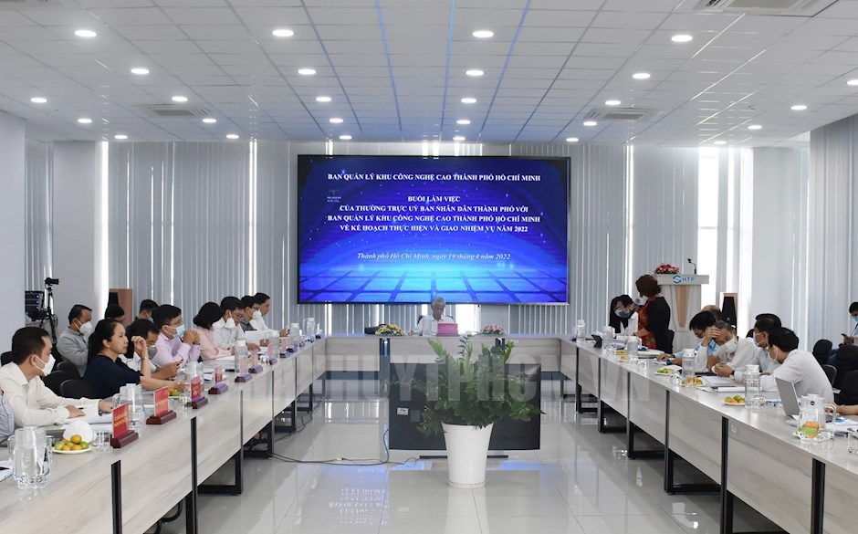 Các đại biểu tham dự buổi làm việc(Thanhuytphcm.vn) – Ngày 19/4, đoàn công tác của UBND TPHCM do đồng chí Võ Văn Hoan, Thành ủy viên, Phó Chủ tịch UBND TPHCM đã có buổi làm việc Ban Quản lý Khu Công nghệ cao TPHCM (SHTP) về kế hoạch thực hiện và giao nhiệm vụ năm 2022.