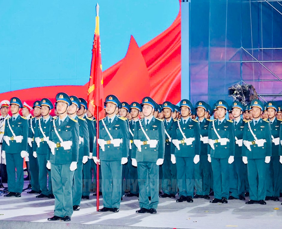 Khối Không quân Việt Nam đứng nghiêm trang chào cờ trong phần nghi thức chính của buổi lễ. Khối Không quân Việt Nam đứng nghiêm trang chào cờ trong phần nghi thức chính của buổi lễ.