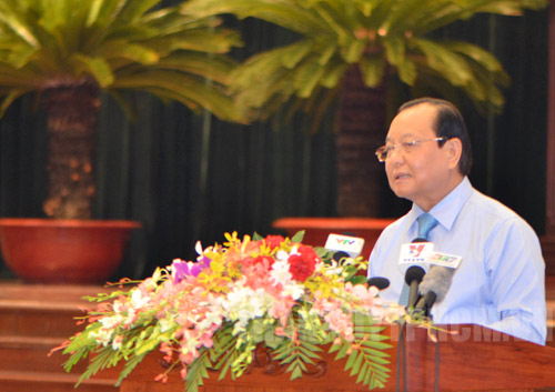 Hôm nay, trong niềm tự hào, vinh dự và trách nhiệm của Thành phố được mang tên Chủ tịch Hồ Chí Minh vĩ đại, Thành phố anh hùng, chúng ta cùng nhau nhìn lại chặng đường đã đi qua để vững bước vươn tới; đúc kết thực tiễn, làm rõ hơn cơ sở của mục tiêu, nhiệm vụ xây dựng, bảo vệ, phát triển thành phố bằng tinh thần khoa học, cách mạng là việc làm hết sức quan trọng và cần thiết, để tiếp tục tiến lên trong giai đoạn đẩy mạnh toàn diện sự nghiệp đổi mới, thực hiện công nghiệp hóa, hiện đại hóa đất nước, bảo vệ vững chắc Tổ quốc Việt Nam xã hội chủ nghĩa. Trên tinh thần đó, nhân dịp kỷ niệm những ngày lịch sử trọng đại của dân tộc: 85 năm Ngày thành lập Đảng Cộng sản Việt Nam; 40 năm Ngày giải phóng miền Nam, thống nhất Tổ quốc; 125 năm ngày sinh Chủ tịch Hồ Chí Minh; 70 năm Cách mạng Tháng Tám và Quốc khánh 02 tháng 9; năm tiến hành đại hội đảng các cấp, Đại hội X Đảng bộ thành phố, tiến tới Đại hội XII của Đảng ta,… Thành ủy, Hội đồng nhân dân, Ủy ban nhân dân, Ủy ban Mặt trận Tổ quốc Việt Nam thành phố Hồ Chí Minh trang trọng tổ chức Hội thảo khoa học “Thành phố Hồ Chí Minh - 40 năm xây dựng, phát triển và hội nhập”. Thay mặt Lãnh đạo thành phố, tôi nồng nhiệt chào mừng các đồng chí lãnh đạo, nguyên lãnh đạo của Đảng, Nhà nước, Mặt trận Tổ quốc Việt Nam; các đồng chí cán bộ lão thành cách mạng, các đồng chí tướng lĩnh, anh hùng lực lượng vũ trang nhân dân, anh hùng lao động; các đồng chí Ủy viên Trung ương Đảng; các đồng chí lãnh đạo các ban, bộ, ngành, đoàn thể Trung ương; các đồng chí lãnh đạo Thủ đô Hà Nội, các Tỉnh; các đồng chí đại biểu; các nhà khoa học, nhà nghiên cứu, nhân sĩ, trí thức; các vị đại biểu đồng bào dân tộc, tôn giáo và các bạn tham dự Hội thảo quan trọng này; xin gửi đến các đồng chí, các vị đại biểu và các bạn sự trân trọng, lời biết ơn chân thành và tình cảm quý mến nhất.