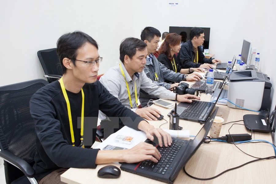 Phóng viên, biên tập viên Thông tấn xã Việt Nam tác nghiệp tại Trung tâm báo chí Quốc tế. (Ảnh: TTXVN)Sáng 8/11, Ủy viên Trung ương Đảng, Bộ trưởng Bộ Thông tin và Truyền thông Trương Minh Tuấn đã đi thăm, kiểm tra công tác chuẩn bị cơ sở hạ tầng đường truyền internet phục vụ tổ chức các hội nghị chính, các cuộc họp, họp báo và một số địa điểm trong khuôn khổ Tuần lễ Cấp cao APEC 2017 tại Đà Nẵng.