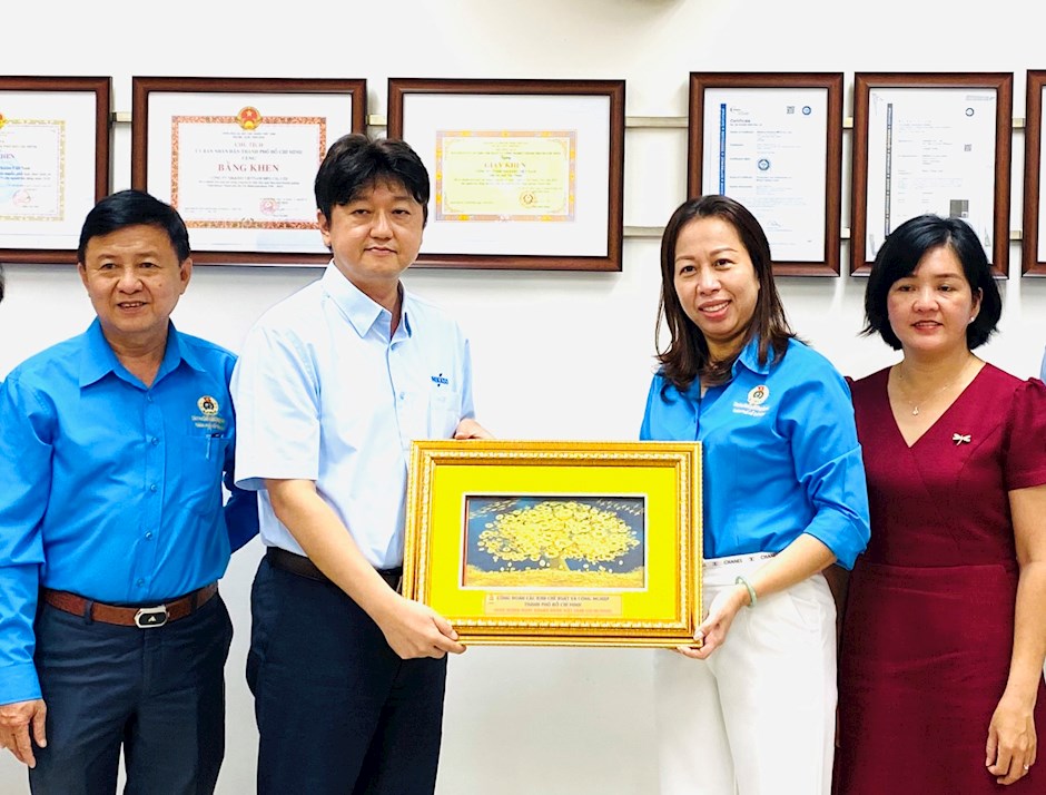 Đồng chí Vũ Thế Vân cùng các đại biểu chúc mừng các doanh nghiệp tiêu biểu.(Thanhuytphcm.vn) - Nhân kỷ niệm ngày Doanh nhân Việt Nam 13/10, sáng 4/10, đoàn đại biểu Công đoàn các Khu chế xuất và công nghiệp TPHCM do đồng chí Vũ Thế Vân, Ủy viên Ban Chấp hành Tổng Liên đoàn Lao động Việt Nam, Chủ tịch Công đoàn các khu chế xuất và công nghiệp TP làm trưởng đoàn đã đến thăm và chúc mừng các doanh nghiệp tiêu biểu trong Khu chế xuất Tân Thuận, Quận 7.