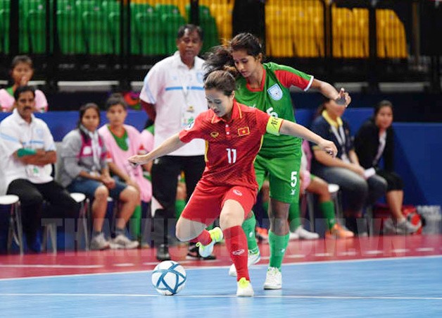 Lên tinh thần sau trận thắng 1-0 trước Đài Bắc Trung Hoa hai ngày trước đó, các cô gái Việt Nam đã nhập cuộc đầy hưng phấn trước Bangladesh, đội bóng được đánh giá yếu nhất của bảng này. Kết thúc 20 phút của hiệp đầu tiên, đội Việt Nam đã vươn lên dẫn 3-0 sau các pha lập công của Đỗ Thị Nguyên và Thùy Trinh. Sang hiệp hai, đội Việt Nam tiếp tục duy trì thế trận lấn lướt và lần lượt ghi thêm 4 bàn thắng để ấn định chiến thắng 7-0. Trong đó, Đỗ Thị Nguyên tỏa sáng với 3 bàn thắng.
