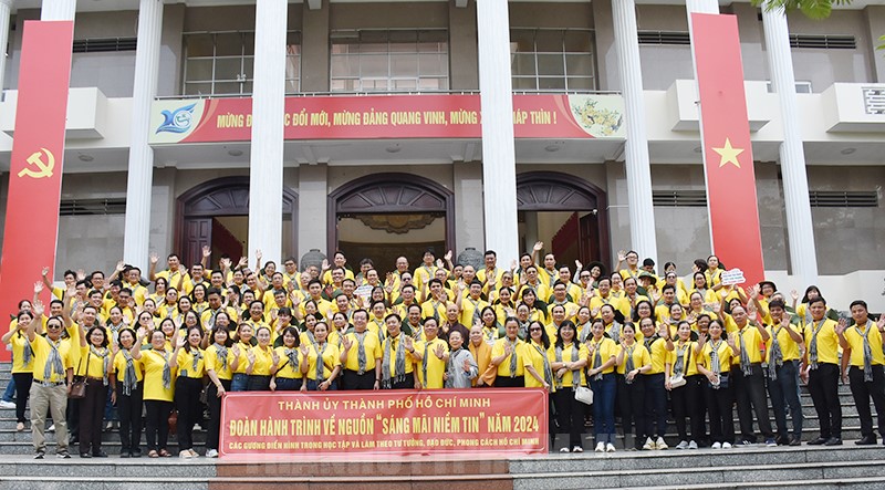 Thành ủy viên, Phó trưởng Ban Thường trực Ban Tuyên giáo Thành ủy TPHCM Lê Hồng Sơn và các thành viên tham gia Hành trình về nguồn “Sáng mãi niềm tin” năm 2024.(Thanhuytphcm.vn) - Hành trình về nguồn “Sáng mãi niềm tin” năm 2024 do Thành ủy TPHCM tổ chức với sự tham gia của gần 200 gương điển hình tiên tiến học tập và làm theo tư tưởng, đạo đức phong cách Hồ Chí Minh đã đến nhiều địa danh lịch sử tại tỉnh Trà Vinh và TP Cần Thơ. Qua hành trình, các thành viên trong đoàn càng cảm nhận sâu sắc về những tình cảm tôn kính của người dân trên mảnh đất miền Tây Nam bộ với Chủ tịch Hồ Chí Minh; về tinh thần kiên trung, bất khuất của những chiến sĩ cách mạng, đồng bào trên mảnh đất này…