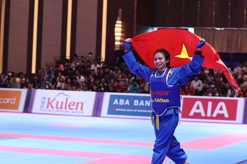 Võ sĩ Vovinam Lê Thị Hiền ăn mừng tấm HCVMôn Vovinam, Lê Thị Hiền đã xuất sắc đoạt HCV hạng cân 55kg nữ, sau khi đánh bại đối thủ Lào Alisa Panyasyli 7-0 ở chung kết.