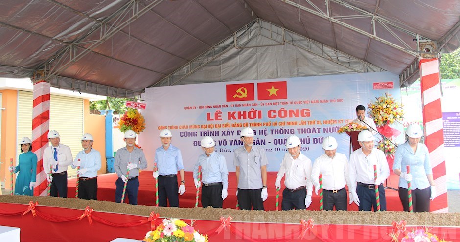 Các đồng chí lãnh đạo quận thực hiện nghi thức khởi công công trình(Thanhuytphcm.vn) - Ngày 8/10, UBND quận Thủ Đức đã khởi công công trình: “Xây dựng hệ thống thoát nước đường Võ Văn Ngân, quận Thủ Đức”. Đây là công trình chào mừng Đại hội Đảng bộ Thành phố Hồ Chí Minh lần thứ XI, nhiệm kỳ 2020 – 2025.