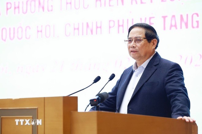 Thủ tướng Phạm Minh Chính phát biểu khai mạc hội nghị. (Ảnh: TTXVN)Thủ tướng hoan nghênh các bộ, ngành, địa phương bày tỏ quyết tâm, tính chiến đấu cao, nỗ lực, sẵn sàng và tích cực triển khai nhiệm vụ; yêu cầu các bộ, ngành, địa phương giao chỉ tiêu, nhiệm vụ cho cấp dưới trực thuộc để cả nước hoàn thành mục tiêu đề ra.