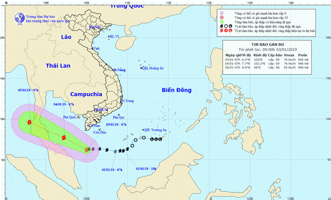 Dự báo trong 24 giờ tới, bão di chuyển theo hướng Tây Tây Bắc, mỗi giờ đi được khoảng 15 km. Tức là đến 7 giờ ngày 4/1, vị trí tâm bão khoảng 7,7 độ Vĩ Bắc; 102,2 độ Kinh Đông, cách mũi Cà Mau khoảng 280 km về phía Tây Tây Nam, cách đảo Thổ Chu (Kiên Giang) khoảng 230 km về phía Tây Nam. Sức gió mạnh nhất vùng gần tâm bão mạnh cấp 8-9 (60-90 km/giờ), giật cấp 11. Bán kính gió mạnh cấp 6, giật cấp 8 khoảng 120 km tính từ tâm bão.