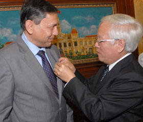 Chủ tịch Lê Hoàng Quân trao tặng logo TPHCM cho Đại sứ Ấn Độ Ranjit Rac