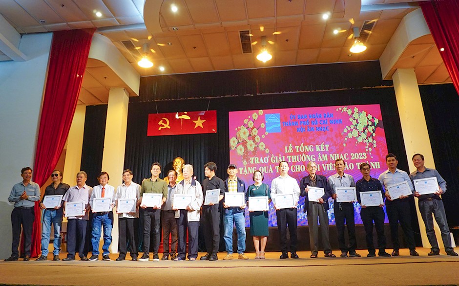 Hội Âm nhạc TPHCM trao các giải thưởng ở thể loại ca khúc (Ảnh: Hội Âm nhạc TPHCM)(Thanhuytphcm.vn) - Ngày 28/12, Hội Âm nhạc TPHCM tổ chức lễ tổng kết hoạt động năm 2023, trao Giải thưởng Âm nhạc năm 2023 và tặng quà tết cho hội viên lão thành từ 70 tuổi trở lên.