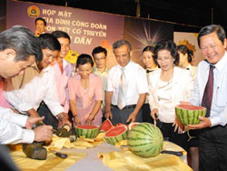 Lãnh đạo Thành ủy, UBND, Tổng LĐLĐ VN và LĐLĐ TPHCM cắt bánh tét, dưa hấu trong ngày hội “Gia đình Công đoàn”