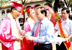Chủ tịch cũng đã biểu dương những thành tích mà ngành giáo dục TP nói chung đã đạt được trong thời gian qua. Bên cạnh đó, trong năm học này, ngành giáo dục đẩy mạnh đổi mới và chăm lo phát triển sự nghiệp giáo dục nhiều hơn nữa. Chủ tịch cho biết quan tâm đến sự nghiệp giáo dục, năm học này, TP đầu tư 26% ngân sách dành cho giáo dục. Với chủ đề năm học mới do Bộ Giáo dục-đào tạo đề ra, đòi hỏi ngành giáo dục TP đẩy mạnh đổi mới phương pháp giảng dạy, quan tâm đến việc giáo dục nhân cách, rèn kỹ năng sống cho học sinh. Đồng thời, giảm khoảng cách chất lượng giáo dục giữa nội và ngoại thành. Bên cạnh đó, học sinh cũng phải không ngừng nỗ lực phấn đấu trong học tập.