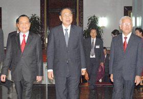 Bí thư Thành ủy TPHCM Lê Thanh Hải (bìa trái) và Chủ tịch UBND TP Lê Hoàng Quân (bìa phải) đón tiếp Tổng Bí thư, Chủ tịch nước Cộng hòa Dân chủ Nhân dân Lào Chum-ma-ly Xay-nha-xỏn tại Dinh Thống Nhất