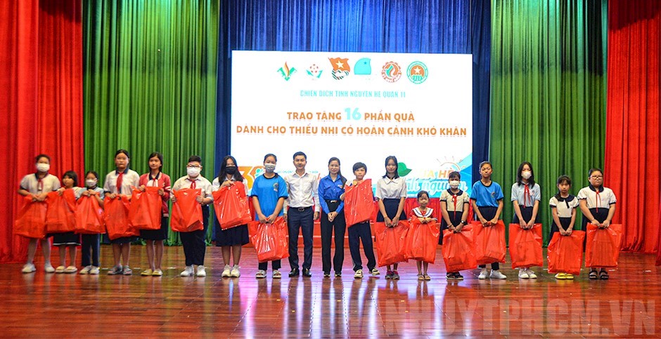 Ban Chỉ huy các chiến dịch tình nguyện hè trao tặng 16 phần quà đến các em thiếu nhi có hoàn cảnh khó khăn(Thanhuytphcm.vn) - Ngày 11/6, tại Hội trường Nhà thiếu nhi Quận 11 đã diễn ra Lễ ra quân các chiến dịch tình nguyện hè năm 2023. Tham dự lễ có các đồng chí: Võ Quốc Bảo, Quận ủy viên, Phó Trưởng ban Thường trực Ban Dân vận Quận ủy; Phùng Tiến Khoa, cán bộ Ban Tuyên giáo - Đối ngoại Thành Đoàn; cùng sự hiện diện của hơn 500 đoàn viên, hội viên, thiếu nhi Quận 11.