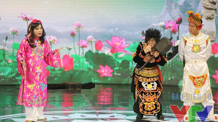 "Cô Đẩu" Công Lý, trợ lý Thiên Lôi Minh Quân và Thiên Lôi Tuấn Hưng trong Táo quân 2015. (Ảnh: VTV.vn)