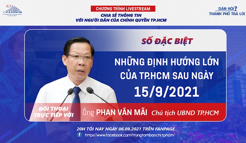 (Thanhuytphcm.vn) - Trong chương trình livestream “Dân hỏi - Thành phố trả lời” đặc biệt tối 6/9, Chủ tịch UBND TPHCM Phan Văn Mãi sẽ tham dự để trực tiếp chia sẻ thông tin với người dân về những định hướng, kế hoạch của Thành phố trong công tác phòng, chống dịch Covid-19 sau ngày 15/9/2021.