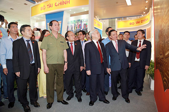 Tổng Bí thư Nguyễn Phú Trọng đã tham quan và chúc mừng nhiều gian trưng bày của các Bộ, tỉnh, thành phố, cơ quan như: Bộ Kế hoạch & Đầu tư, Bộ Công Thương, Bộ Xây dựng, TPHCMM, Đài Truyền hình Việt Nam, Thông tấn xã Việt Nam, Ninh Bình, Hà Giang...