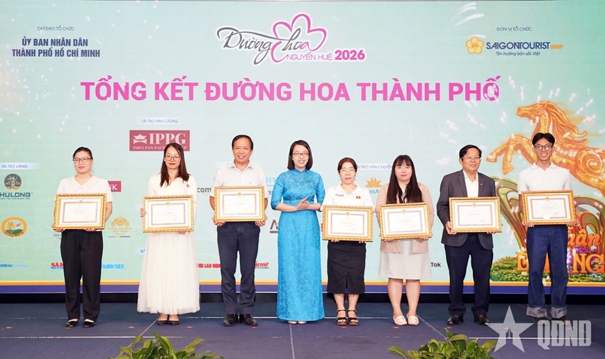 Ban tổ chức trao thưởng tặng cá nhân tiêu biểu.Tại hội nghị, ban tổ chức đã trao khen thưởng tặng 8 cơ quan Tổng Lãnh sự quán tại TP Hồ Chí Minh, 16 tập thể và 38 cá nhân có đóng góp tiêu biểu cho công trình Đường hoa TP Hồ Chí Minh Tết Bính Ngọ 2026. Trong đó, Ban đại diện Báo Quân đội nhân dân tại TP Hồ Chí Minh được nhận Bằng khen của UBND TP Hồ Chí Minh.