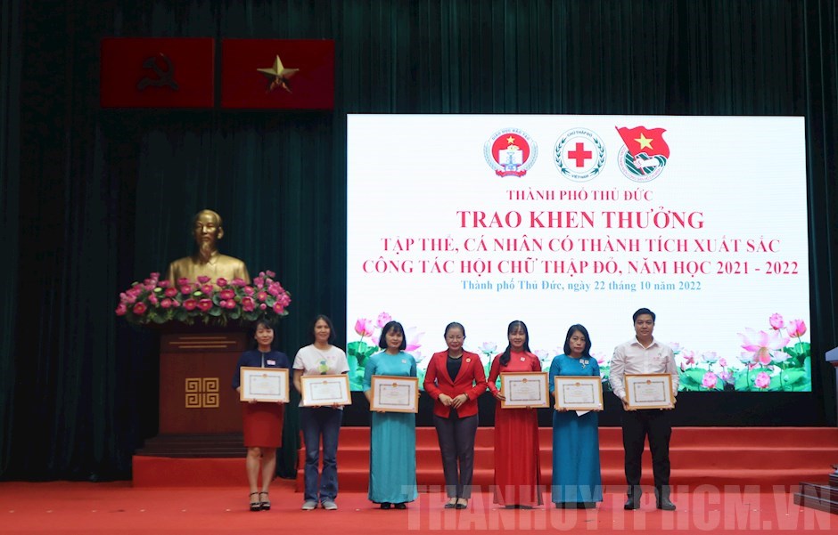 Đồng chí Đặng Thị Minh Hiếu trao giấy khen của Hội CTĐ TPHCM cho các tập thể(Thanhuytphcm.vn) - Sáng 22/10, Hội Chữ thập đỏ (CTĐ), Phòng Giáo dục và Đào tạo (GD-ĐT), Thành Đoàn TP Thủ Đức phối hợp tổ chức hội nghị tổng kết công tác CTĐ khối trường học, năm học 2021 - 2022. Tham dự hội nghị có các đồng chí: Đặng Thị Minh Hiếu, Phó Chủ tịch Hội CTĐ TPHCM; Nguyễn Chính Tâm, Chánh Văn phòng Đảng ủy Sở GD-ĐT TPHCM; Nguyễn Kỳ Phùng, Ủy viên Ban Thường vụ Thành ủy, Phó Chủ tịch UBND TP Thủ Đức; Nguyễn Văn Băng, Phó Trưởng ban Dân vận Thành ủy Thủ Đức; Đặng Trần Nguyên Thảo, Chủ tịch Hội CTĐ TP Thủ Đức; Kiều Mỹ Chi, Phó Trưởng phòng GD-ĐT TP Thủ Đức; Giáp Thị Thu Thủy, Phó Bí thư Thành Đoàn TP Thủ Đức…