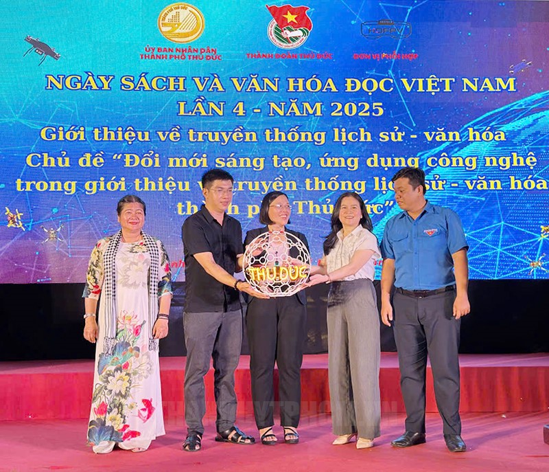 Các đại biểu thực hiện nghi thức khai mạc chương trình.(Thanhuytphcm.vn) - Tối 21/4, tại Đường Sách TP Thủ Đức, Phòng Khoa học – Công nghệ và Thông tin, Phòng Văn hóa - Thể thao và Du lịch, Trung tâm Văn hóa, Thành Đoàn TP Thủ Đức và Công ty TNHH MTV HDFPV phối hợp tổ chức hoạt động giới thiệu về truyền thống lịch sử - văn hóa của thành phố thông qua các ứng dụng công nghệ với chủ đề “Đổi mới sáng tạo, ứng dụng công nghệ trong giới thiệu về truyền thống lịch sử - văn hóa của TP Thủ Đức”.
