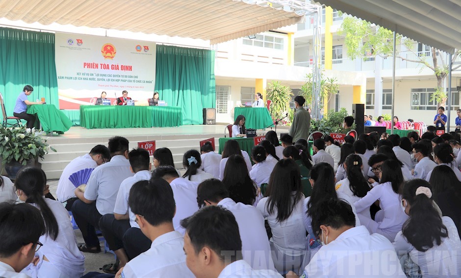 Quang cảnh phiên tòa giả định(Thanhuytphcm.vn) – Sáng 3/4, Tòa án nhân dân TP Thủ Đức phối hợp Trường THPT Phước Long tổ chức phiên tòa giả định xét xử vụ án “Lợi dụng các quyền tự do dân chủ, xâm phạm lợi ích Nhà nước, quyền, lợi ích hợp pháp của tổ chức, cá nhân” theo quy định tại Điều 331 Bộ Luật Hình sự.
