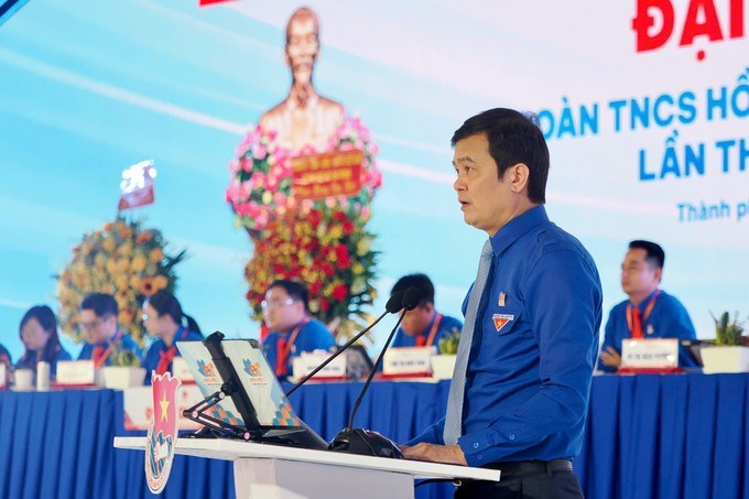 Đồng chí Bùi Quang Huy, Bí thư thứ nhất Trung ương Đoàn phát biểu tại đại hội. (Ảnh: SGGP)
