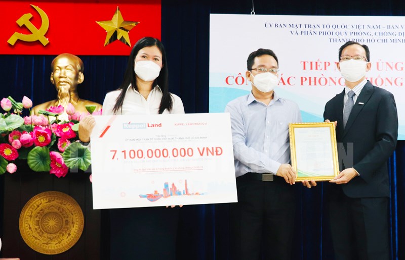Công ty Keppel LandViệt Nam và Công ty TNHH Keppel Land Watco Two ủng hộ 5 tỷ đồng Quỹ Vaccine và các trang thiết bị y tế trị giá hơn 7,1 tỷ đồng.(Thanhuytphcm.vn) - Trưa 20/10, Ban Thường trực Ủy ban MTTQ Việt Nam TPHCM - Ban vận động, tiếp nhận và phân phối tiền, hàng ủng hộ phòng, chống dịch Covid -19 TP tổ chức buổi lễ tiếp nhận ủng hộ vật tư, trang thiết bị y tế, hỗ trợ kinh phí, nhu yếu phẩm cho công tác phòng, chống dịch trị giá gần 27 tỷ đồng. Đến dự có Phó Chủ tịch Ủy ban MTTQ Việt Nam TP Phạm Minh Tuấn.