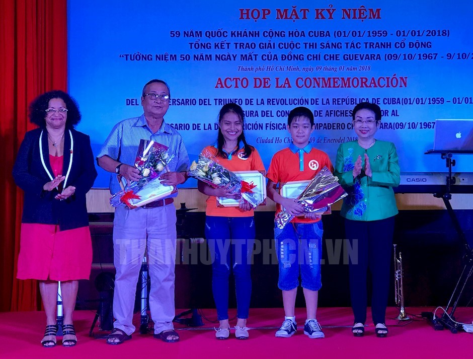 Tổng Lãnh sự Cuba tại TPHCM Indira Lopez Arguelles (bìa trái); Chủ tịch Hội Hữu nghị Việt Nam – Cuba TPHCM Trương Thị Hiền (bìa phải) trao giải cho các tác phẩm đạt giải Nhất cuộc thi sáng tác tranh cổ động “Tưởng niệm 50 năm ngày mất của đồng chí Che Guevara”.(Thanhuytphcm.vn)- Trưa 9/1, Liên hiệp Các tổ chức hữu nghị TPHCM phối hợp Hội Hữu nghị Việt Nam – Cuba TPHCM tổ chức họp mặt kỷ niệm 59 năm Quốc khánh Cuba (1/1/1959-1/1/2018) và tổng kết trao giải cuộc thi sáng tác tranh cổ động “Tưởng niệm 50 năm ngày mất của đồng chí Che Guevara”. Đến dự có Tổng Lãnh sự Cuba tại TPHCM Indira Lopez Arguelles; Chủ tịch Hội Hữu nghị Việt Nam – Cuba TPHCM Trương Thị Hiền.