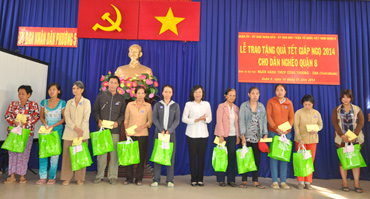 Quận 8 hiện có gần 4.000 hộ nghèo có mức thu nhập dưới 16 triệu đồng/người/năm. Quận đã vận động 149 đơn vị, cá nhân trong và ngoài quận hơn 2 tỷ đồng chăm lo cho dân nghèo đón Tết cổ truyền dân tộc Xuân Giáp Ngọ 2014.