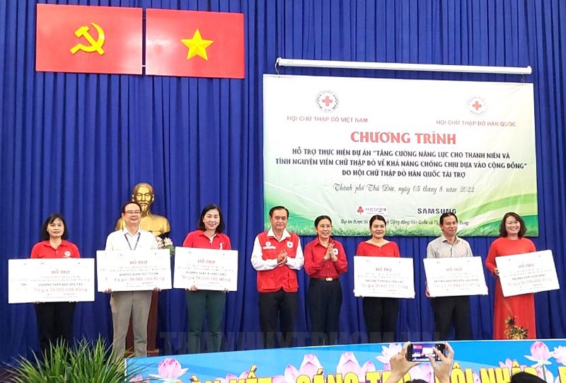 Đồng chí Huỳnh Thị Xuân Lam và đồng chí Trần Trường Sơn trao bảng tượng trưng hỗ trợ đến 6 trường tham gia thực hiện dự án.(Thanhuytphcm.vn) - Ngày 5/8, tại trường THPT Thủ Thiêm, thành phố Thủ Đức, Ban điều hành dự án của Trung ương Hội cùng Hội Chữ thập đỏ TPHCM tổ chức triển khai hoạt động thực hiện Dự án “Tăng cường năng lực cho thanh niên và tình nguyện viên Chữ thập đỏ về khả năng chống chịu dựa vào cộng đồng”.