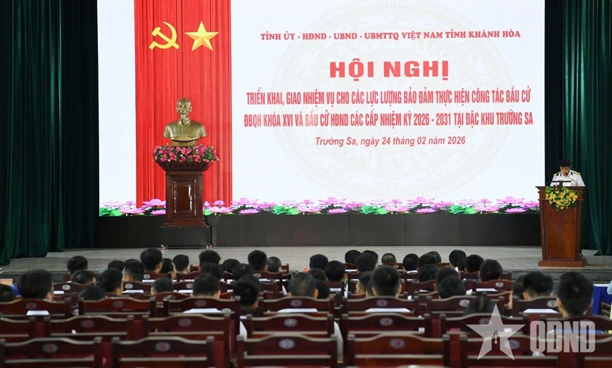 Quang cảnh hội nghị.Sáng 24/2, đồng chí Hồ Xuân Trường, Ủy viên dự khuyết Trung ương Đảng, Phó bí thư Thường trực Tỉnh ủy, Bí thư Đảng ủy các cơ quan Đảng tỉnh Khánh Hòa đã chủ trì hội nghị triển khai, giao nhiệm vụ cho các lực lượng bảo đảm công tác bầu cử sớm đại biểu Quốc hội khóa XVI và đại biểu Hội đồng nhân dân (HĐND) các cấp nhiệm kỳ 2026 - 2031 tại Đặc khu Trường Sa.