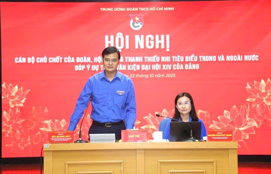 Đồng chí Bùi Quang Huy, Ủy viên dự khuyết Trung ương Đảng, Phó chủ tịch Ủy ban Trung ương Mặt trận Tổ quốc Việt Nam, Bí thư thứ nhất Trung ương Đoàn (bên trái) và đồng chí Nguyễn Phạm Duy Trang, Bí thư Trung ương Đoàn, Chủ tịch Hội đồng Đội Trung ương chủ trì hội nghị.Ngày 22/10, tại Hà Nội, Trung ương Đoàn TNCS Hồ Chí Minh tổ chức Hội nghị cán bộ chủ chốt của Đoàn, Hội, Đội và thanh thiếu nhi tiêu biểu trong và ngoài nước góp ý dự thảo văn kiện Đại hội XIV của Đảng. Hội nghị được tổ chức trực tiếp và trực tuyến đến gần 4.100 điểm cầu với tổng số hơn 80.800 đại biểu tham dự.