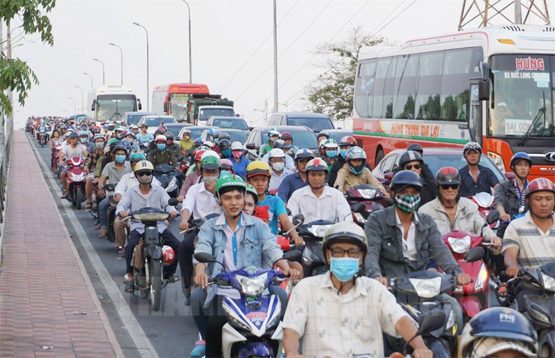 Dòng xe xếp hàng dài trên cầu Bình Triệu 2 chiều 29/1(Thanhuytphcm.vn) - Chiều 29/1 (tức ngày 24 tháng Chạp), lượng hành khách từ các nơi đổ về Bến xe miền Đông mua vé và chờ xe về quê đón Tết đông khiến cho các tuyến đường xung quanh bến xe bị ùn tắc nghiêm trọng.