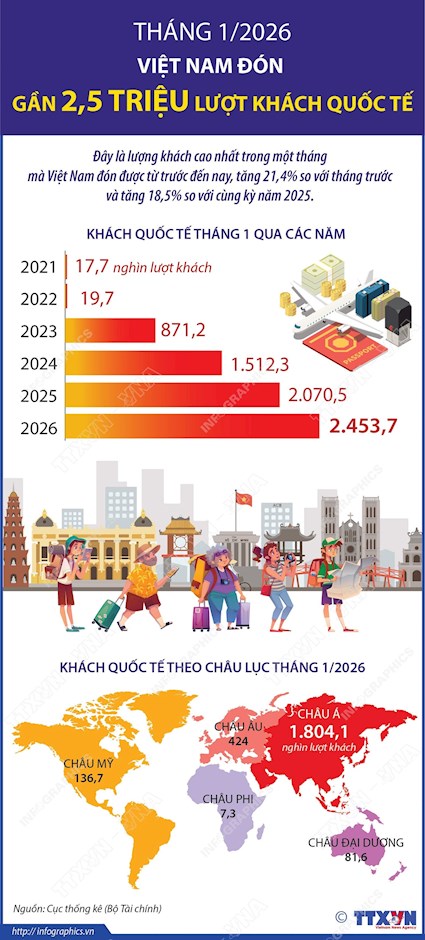 Tháng 1/2026, Việt Nam đón gần 2,5 triệu lượt khách quốc tế. Đây là lượng khách cao nhất trong một tháng mà Việt Nam đón được từ trước đến nay, tăng 21,4% so với tháng trước và tăng 18,5% so với cùng kỳ năm 2025./.