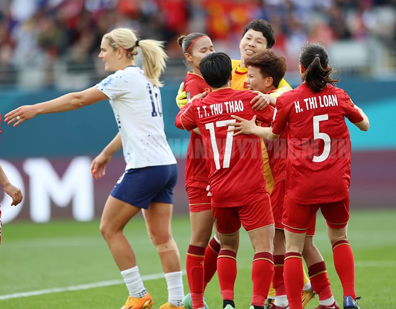 Đồng đội chia vui cùng thủ môn Kim Thanh khi cản phá thành công pha đá phạt 11m của Morgan. (Ảnh: Đức Đồng)(Thanhuytphcm.vn) - VCK World Cup nữ 2023 bước sang ngày thi đấu thứ 3, nhưng với người hâm mộ bóng đá Việt Nam thì ngày 22/7 mới thực sự bắt đầu khi chứng kiến thời khắc lịch sử, đội tuyển nữ Việt Nam lần đầu ra sân ở ngày hội lớn nhất của bóng đá nữ thế giới. “Cảm xúc của chúng tôi dâng trào khi lần đầu tiên quốc ca Việt Nam được cất lên ở một VCK Workd Cup”, HLV Mai Đức Chung chia sẻ sau trận đấu.