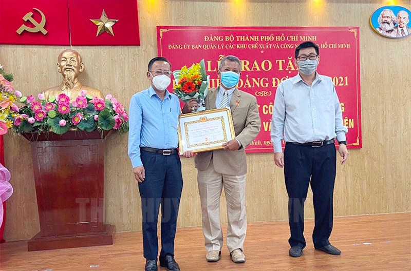 Trưởng Ban Dân vận Thành ủy TPHCM Nguyễn Hữu Hiệp (trái) trao Huy hiệu Đảng và hoa chúc mừng đồng chí Nguyễn Văn Bé.(Thanhuytphcm.vn) - Sáng 11/11, Đảng ủy Ban Quản lý các Khu Chế xuất và Công nghiệp TPHCM đã tổ chức lễ trao Huy hiệu Đảng đợt 07/11/2021 cho đảng viên.
