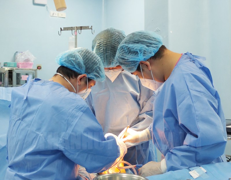 Các bác sĩ thực hiện ca phẫu thuật.(Thanhuytphcm.vn) - Ngày 4/1, Bệnh viện Bình Dân cho biết vừa cứu sống một bệnh nhân nhờ kịp thời thay thế đoạn động mạch chủ bụng đã bị nhiễm trùng ăn thủng bằng màng ngoài tim bò.