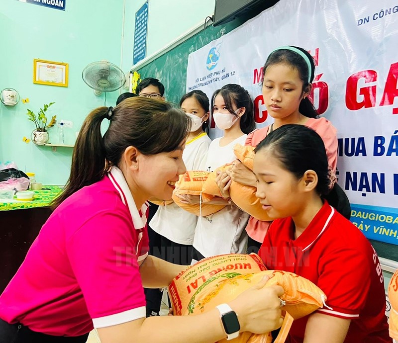 Hội LHPN phường Trung Mỹ Tây trao tặng gạo cho các em học sinh của lớp học.(Thanhuytphcm.vn) - Mô hình “Đi học có gạo” của Hội Liên hiệp phụ nữ (LHPN) phường Trung Mỹ Tây, Quận 12 được thành lập vào tháng 1/2021, lớp học ban đầu có 24 em học sinh và 2 cô giáo đang công tác tại Quận 12 tham gia giảng dạy. Các em học sinh trong lớp học này đều xuất thân từ những hoàn cảnh gia đình rất khó khăn, có em là người dân tộc Khmer, có em mồ côi cha mẹ phải ở với ông bà, có em tuy còn nhỏ nhưng phải đi rửa chén, giúp việc nhà, làm thuê để có tiền phụ giúp gia đình, có em bệnh tâm thần nhẹ… nhưng tất cả các em có chung một mong muốn là được đi học và được đến lớp học mỗi ngày. Đó là lời chia sẻ của đồng chí Lê Thị Trúc Lâm, Bí thư Đảng ủy phường Trung Mỹ Tây, Quận 12.
