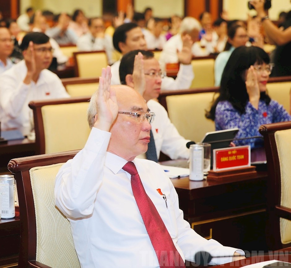 Các đại biểu đã biểu quyết thông qua các tờ trình của UBND TP(Thanhuytphcm.vn) - Tiếp tục chương trình kỳ họp thứ 10, HĐND TPHCM khóa X, nhiệm kỳ 2021-2026, sáng 12/7, HĐND TPHCM biểu quyết thông qua Nghị quyết về Quy định mức hỗ trợ thường xuyên hàng tháng cho các chức danh Đội trưởng, Đội phó Đội dân phòng và trang bị phương tiện phòng cháy, chữa cháy và cứu nạn, cứu hộ cho lực lượng dân phòng trên địa bàn TP.
