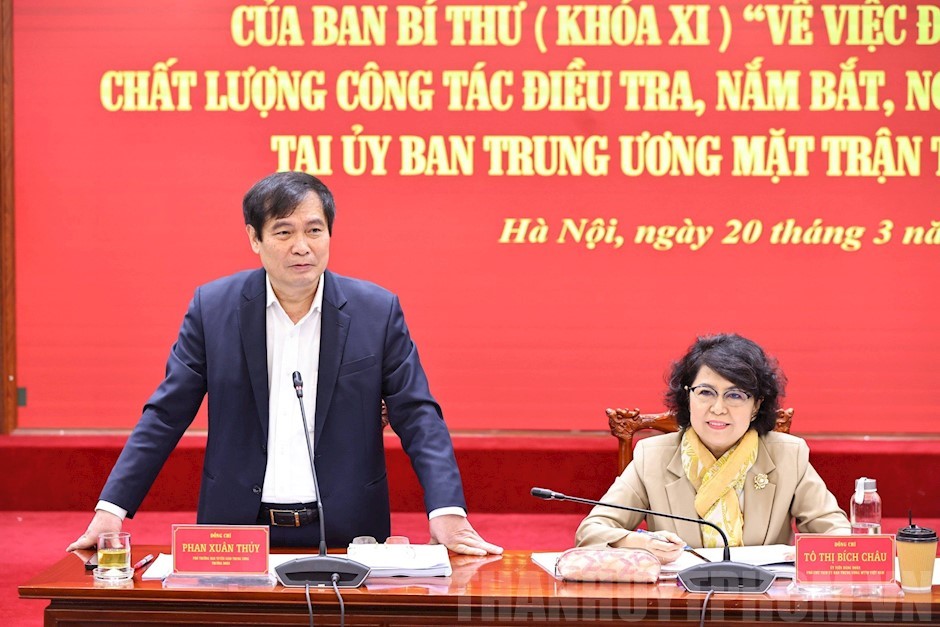 Phát biểu kết luận cuộc làm việc, Phó Trưởng Ban Tuyên giáo Trung ương Phan Xuân Thủy đánh giá, trong những năm qua với tinh thần đổi mới, sáng tạo, công tác điều tra, nắm bắt, nghiên cứu dư luận xã hội của Ủy ban Trung ương MTTQ đã có nhiều chuyển biến tích cực. Phó Trưởng ban Tuyên giáo Trung ương đề nghị Ủy ban Trung ương MTTQ Việt Nam bên cạnh việc phân tích làm rõ những kết quả đạt được, cần phân tích làm rõ những hạn chế, tồn tại từ đó đề ra những giải pháp để tiếp tục đổi mới và nâng cao chất lượng công tác điều tra, nắm bắt, nghiên cứu dư luận xã hội.