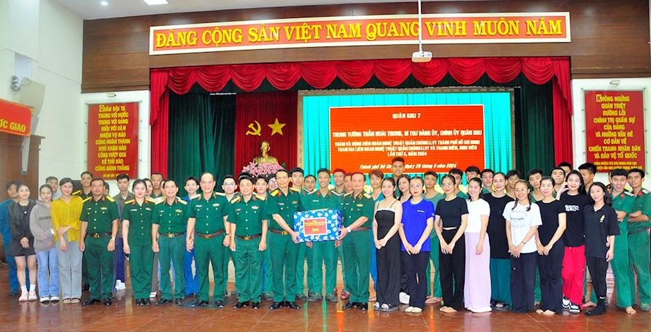 Thủ trưởng Quân khu, Bộ Tư lệnh TP chụp ảnh lưu niệm cùng Đoàn nghệ thuật quần chúng LLVT TPHCM(Thanhuytphcm.vn) - Chiều 20/3, Trung tướng Trần Hoài Trung, Bí thư Đảng ủy, Chính ủy Quân khu 7 cùng thủ trưởng các cơ quan Quân khu đến thăm, động viên đến thăm, động viên Đoàn nghệ thuật quần chúng Lực lượng vũ trang (LLVT) TPHCM tham gia Liên hoan nghệ thuật quần chúng LLVT và thanh niên, sinh viên lần thứ X, năm 2024.